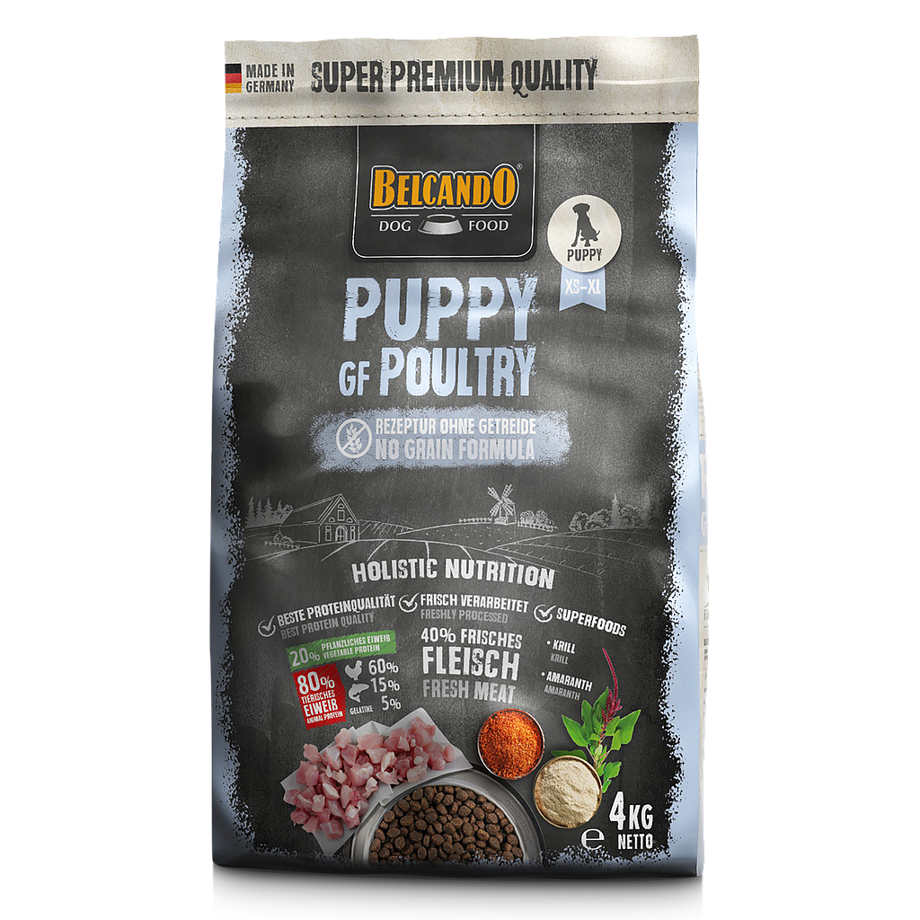 Useat kasvattajat ja pennunomistajat vaativat viljatonta ruokaa koirilleen. Tämän vuoksi on erityisen tärkeää valita oikea resepti alusta alkaen. Tuore siipikarjan liha ja huolellisesti valitut raaka-aineet tekevät BELCANDO® Puppy GF Poultrysta erityisen hyvin siedetyn. Vilja on korvattu tässä reseptissä laadukkaalla amarantilla, joka on ihanteellinen tärkeiden ravintoaineiden lähde. Eläinproteiinin osuus kokonaisproteiinista: 80 % (siipikarjaa 60 %, kalaa/ krilli 15 %, gelatiini 5 %)