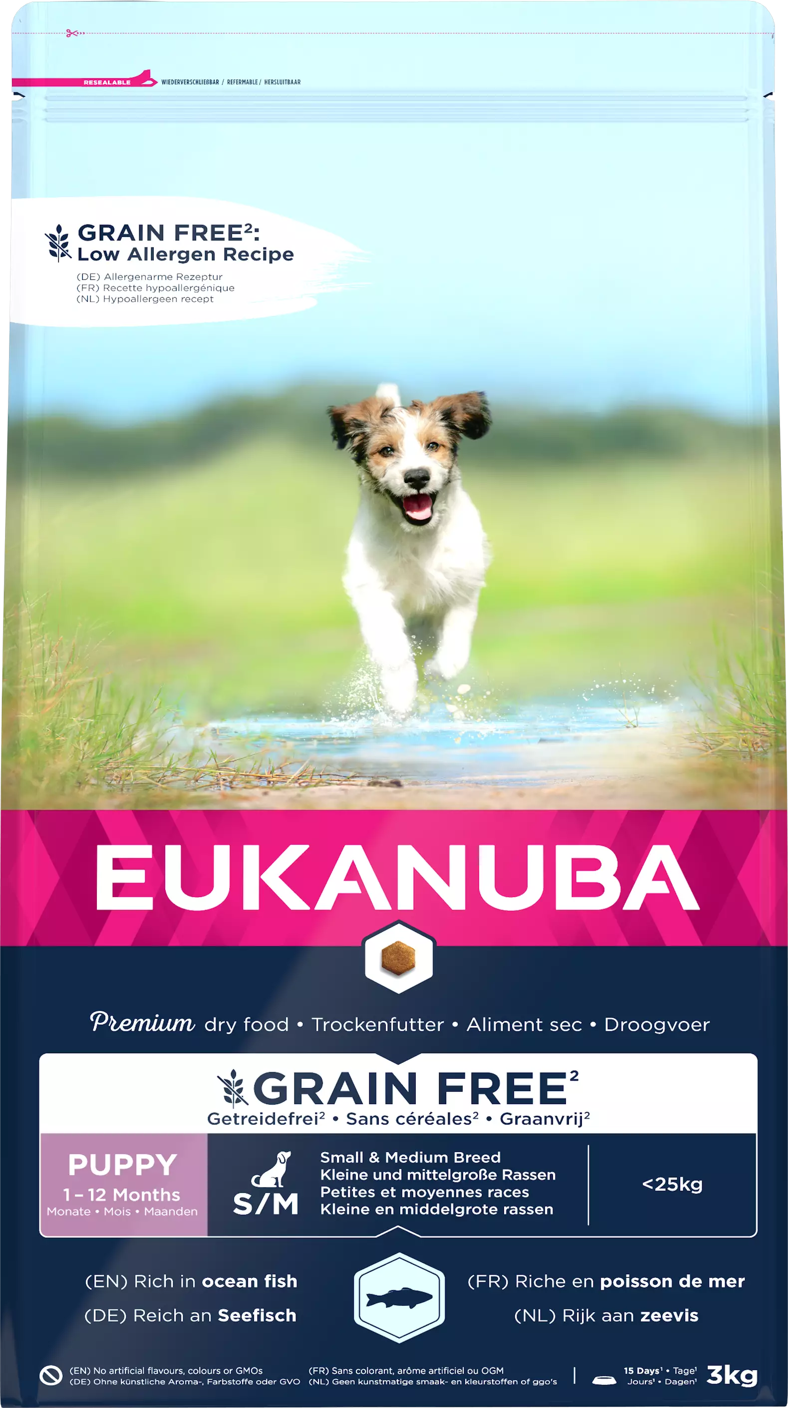 EUKANUBA Ocean Fish Grain Free* -koiranruoka pienten ja keskikokoisten rotujen koiranpennuille on vain vähän allergeeneja sisältävä ravinto, jonka valmistuksessa on vältetty tavanomaisimpia allergeeneja. Vatsa- ja ihoystävällinen ravinto tarjoaa vaihtoehdon koirille, joilla on erityisiä ravintotarpeita, huolehtien samalla, että koirasi saa tarvitsemansa ravintoaineet, vitamiinit ja kivennäisaineet tervettä kasvua ja kehitystä varten.