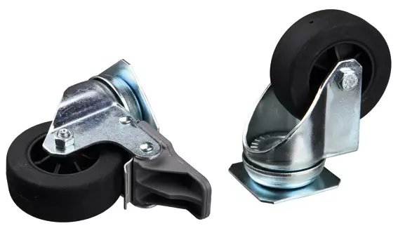 Pyörät 4 kpl pakkaus Skudo-kuljetushäkkiin. Kaksi pyöristä on varustettu jarrupaloilla. Helpottaa häkin (erityisesti suurempien) siirtämistä.