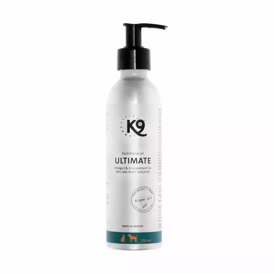 K9 Ultimate Nutritional Oilin pohjana on kylmäpuristettu rapsi- ja pellavansiemenöljy, jotka on tuotettu paikallisesti K9 Competitionin tehtaan lähistöllä. Pellavansiemenöljy sisältää runsaasti ALA-rasvahappoja, joiden on todistettu tukevan ihon ja turkin hyvinvointia. Rapsiöljy sisältää runsaasti omega-6-rasvahappoja, jotka ovat tärkeitä sydämen terveydelle ja ihon suojamuurin tukemiselle. K9 Ultimaten sisältämä leväöljy sisältää markkinoiden korkeimmat pitoisuudet välttämättömiä EPA- ja DHA-rasvahappoja. Haponlähteenä käytetään viljeltyä mikrolevää, alkuperäistä lähdettä, mikä säästää tonneittain kalaa ja tekee siitä kestävän vaihtoehdon omega-3-rasvahappojen saannille. Tuotetta on rikastettu luonnollisella E-vitamiinilisällä.