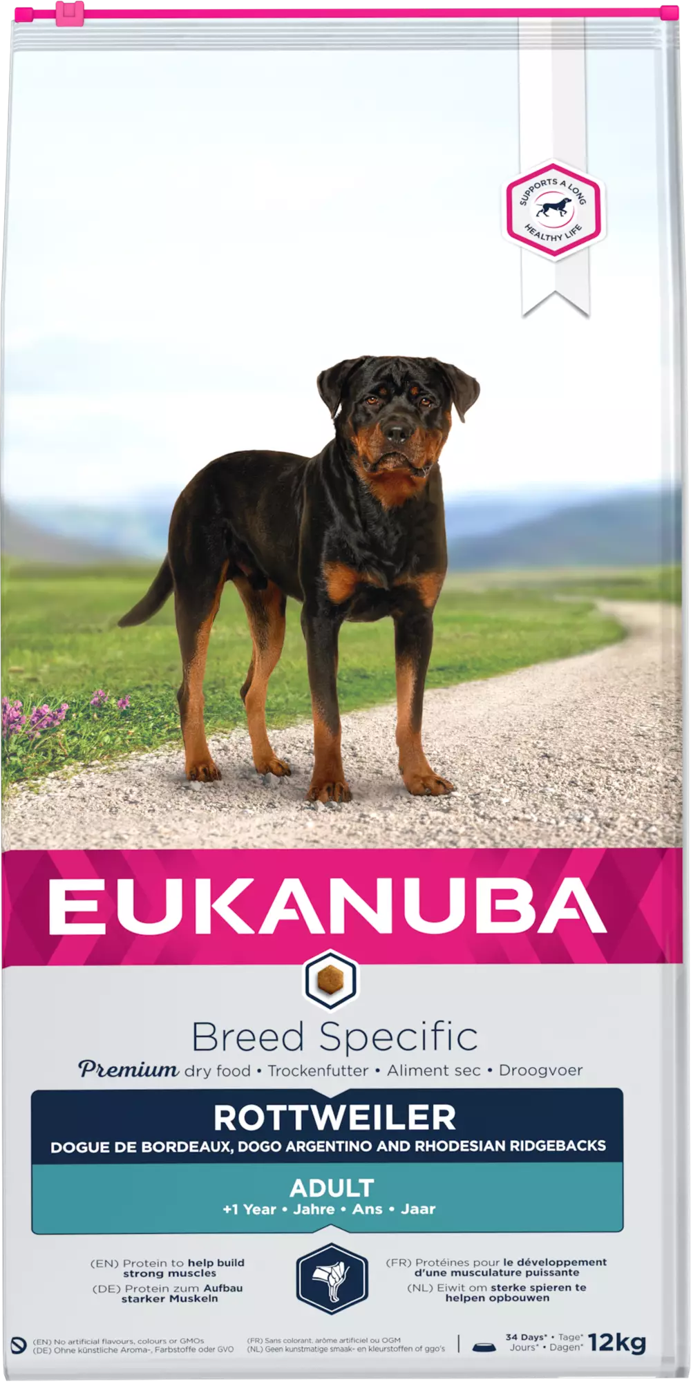 Eukanuban rottweilereille tarkoitettu Adult-kuivaruoka, joka sopii myös Dogue de Bordeaux’lle, Cane Corsolle, Dogo Argentinolle ja Rhodesian Ridgebackille, on valmistettu korkeammalla proteiinipitoisuudella lihasten vahvistamiseksi ja ylläpitämiseksi sekä hyvän yleiskunnon tukemiseksi.