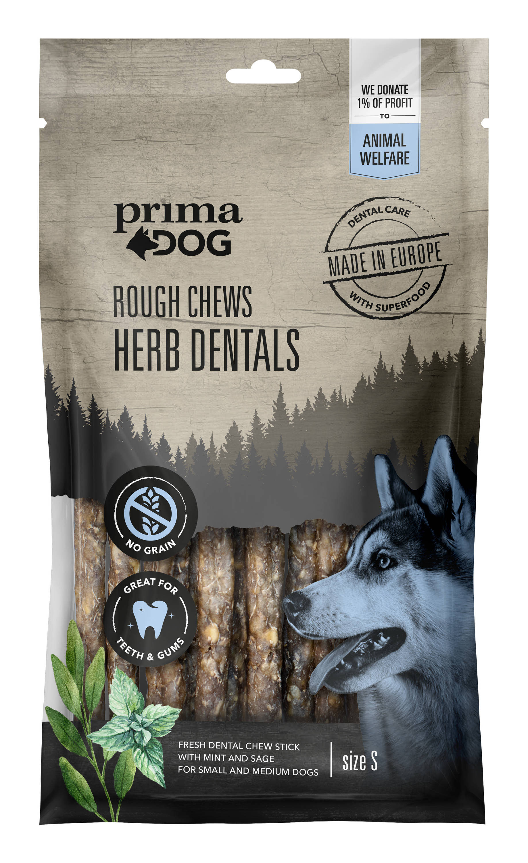 PrimaDog Rough Chews Hammashoitoluu pienille koirille on yrttinen rouhepatukka koirasi hampaiden ja ikenien hyvinvointiin. Tämä naudannahkainen rouheluu paitsi maistuu herkulliselta myös hoitaa koirasi hampaita ja tarjoaa koiralle aktivointihetken lajityypillisen tekemisen parissa. Hammashoitoluu on helppo pureskella, joten se sopii hyvin myös kevyelle puruvoimalle. Hammashoitoluuhun lisätyt yrtit minttu ja salvia raikastavat koirasi hengitystä. Säännöllinen rouhepatukoiden ja puruluiden pureskelu auttaa poistamaan plakkia koiran hampaiden pinnoilta ja ienrajasta, mikä voi ehkäistä hammaskiven muodostumista ja ientulehduksia. Rough Chews Hammashoitoluu sisältää runsaasti proteiinia ja vain vähän rasvaa.