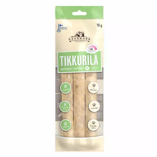 Dagsmark ROUHETIKKU nauta on viljaton ja kevyempi koiran puruherkku. Valmistettu naudannahasta jauhamalla ja käsin muotoilemalla. Tarjoaa turvallista ajanvietettä ja tukee koiran luontaista pureskelun tarvetta. Soveltuu myös kevyelle puruvoimalle. Valkaisematon, säilöntäaineeton ja vastuullisesti valmistettu Kokkolassa. Täydellinen valinta herkkuhetkiin ja hammashygienian tukemiseen. Muista valvoa koiraa sen nauttiessa purutuotteita ja tarjoa herkkua maltillisesti – puruluiden tulisi olla enintään 10 % koiran päivittäisestä energiansaannista.