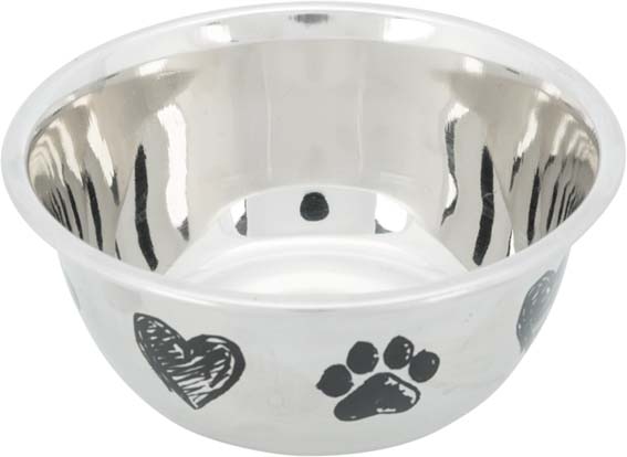 Metallinen ruokakuppi lakatulla tassu/sydän kuviolla. Kulho ruostumattomatonta terästä. Luistamaton kumirengas pohjassa.