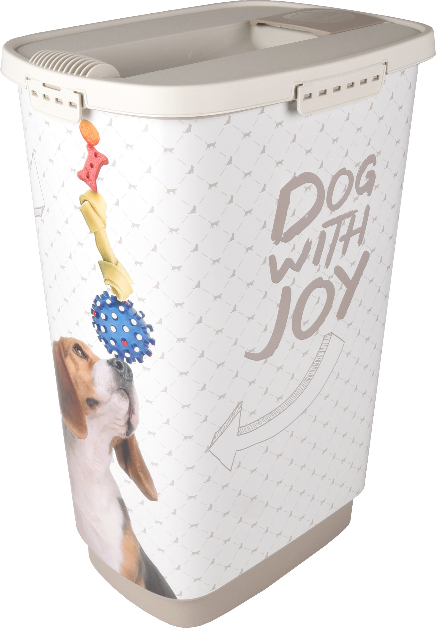 Ilmatiivis, muovinen säilytysastia irrotettavalla, läpällisellä kannella. Mukana myös kauha.