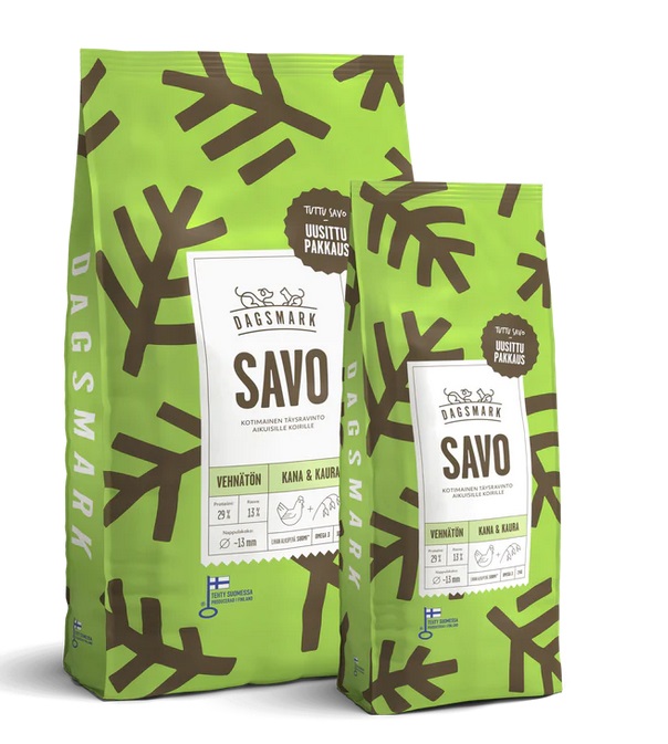 Dagsmark SAVO on kotimaista kanaa ja kauraa sisältävä kuivaruoka. Kotimainen camelinaöljy on hyvä omega-3- ja 6-rasvahappojen lähde, jotka ravitsevat koiran turkkia ja ihoa. Ruoassa on maukas ja proteiinipitoinen koostumus ja sulavuudeltaan erinomaiset raaka-aineet. Dagsmark SAVO tukee koirasi hyvinvointia ja sisältää kaikki koirasi tarvitsemat kivennäisaineet sekä vitamiinit. Kuivaruoka ei sisällä vehnää, soijaa, maissia eikä säilöntä-, aromi- tai väriaineita.