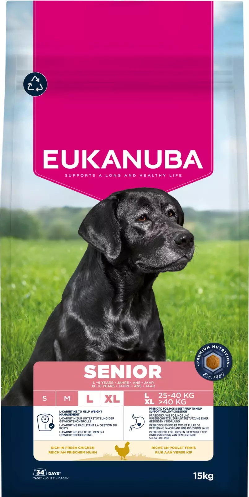 Ruoka on 100 % täysipainoista ja tasapainoista. Kehittynyttä ravintoa suurten rotujen seniorikoirille tukemaan ihannekuntoa ja elinikäistä hyvinvointia.