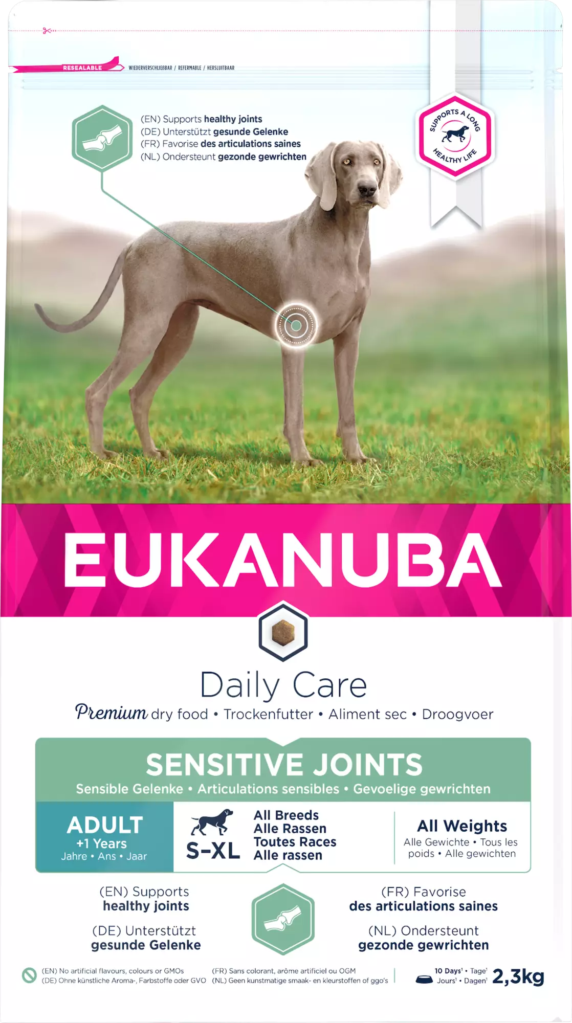 EUKANUBA Daily Care -kuivaruoka nivelten hyvinvointiin nivelongelmista kärsiville koirille. Lisätty glukosamiini ja kondroitiini auttavat ylläpitämään terveitä niveliä ja tukemaan aktiivista liikkuvuutta. Lisäksi L-karnitiini tukee tervettä painonhallintaa ja vähentää rasitusta nivelissä. Nappuloiden erityinen kuusikulmainen muoto ja ainutlaatuinen DentaDefense-teknologia auttavat pitämään hampaat puhtaina ja terveinä. EUKANUBA Daily Care -kuivaruoka nivelten hyvinvointiin sisältää tuoretta kanaa, joka pitää lihakset kiinteinä ja vahvoina. Tarkoin suunniteltu kuitusekoitus, joka sisältää prebiootteja ja juurikasmassaa, tukee tervettä ruoansulatusta. Täydellinen ja tasapainoinen ruoka kaikkien rotujen aikuisille koirille.