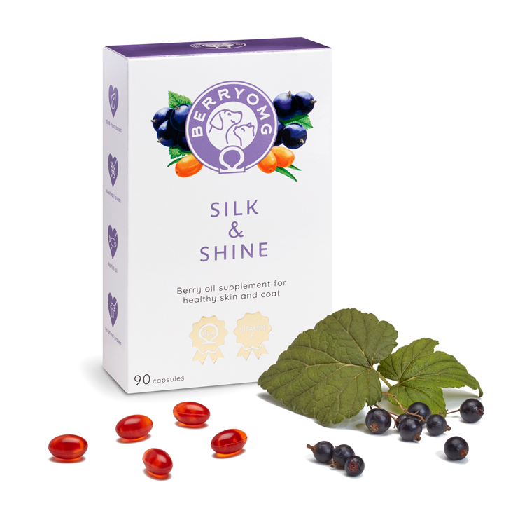 BERRYOMG® Silk & Shine on mustaherukan siemenöljystä ja tyrniöljystä valmistettu ravintolisä ihon hyvinvointiin koirille ja kissoille. Siemenöljyt sisältävät tärkeitä omega-rasvahappoja, jotka auttavat ylläpitämään ihon luontaista suojakerrosta sekä ehkäisevät ihon kuivumista ja auttavat kutiavan ihon hoidossa.