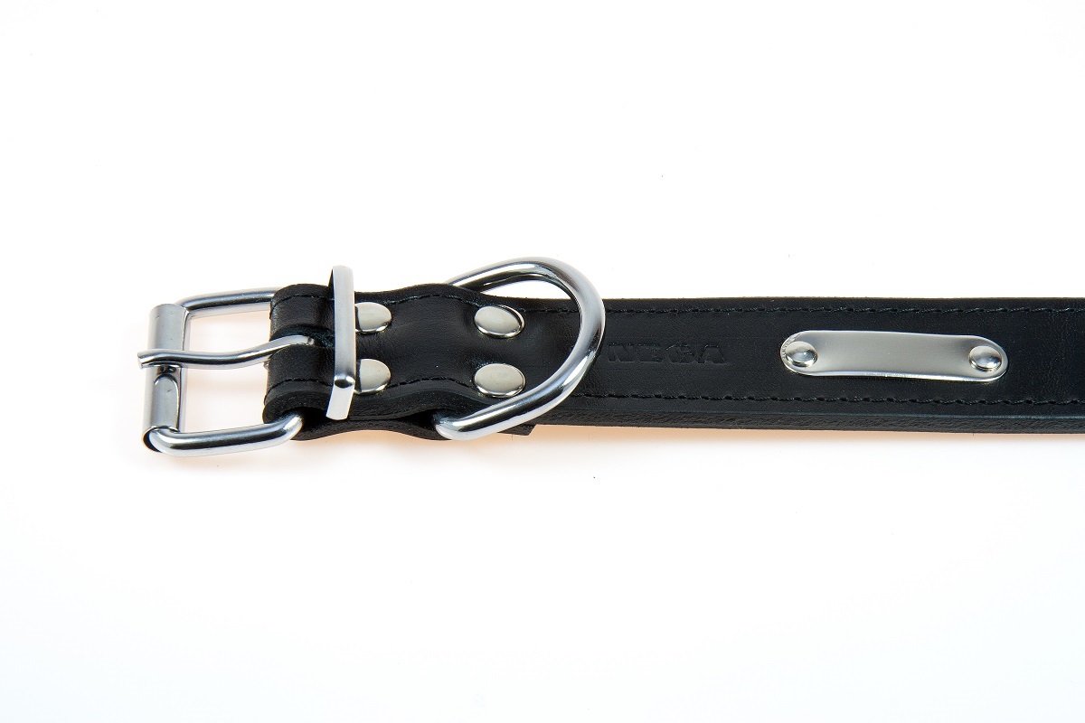 Vahva ja leveä, tuplanahasta valmistettu kaulapanta. Vahvistetut reiät sekä nimilaatta.