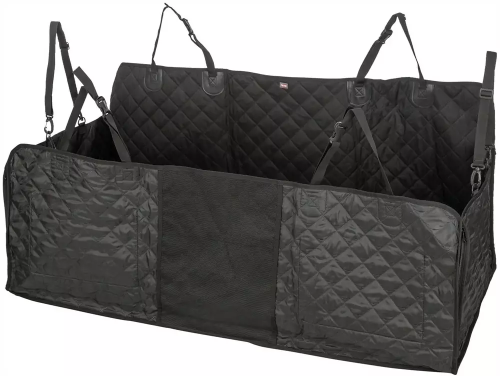 Tukeva takapenkinsuoja pohjalevyllä laajentaa koiran aluetta. Suojaa auton verhoilua, liukumaton alapinta sekä turvavyölle omat aukot.