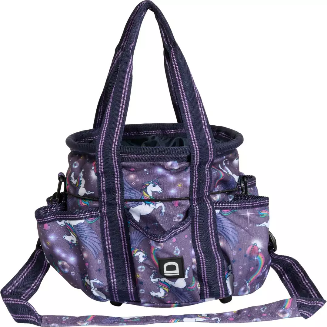 Pyöreäpohjainen hoitolaukku tarvikkeille. Vankka ja hyvin suunniteltu malli, joka kestää päivittäistä käyttöä ja kulutusta. Suuri sisäosasto ja kuusi ulkotaskua. Yläosa suljetaan kiristettävällä kangashupulla. Kantokahvat on valmistettu vahvasta nauhamateriaalista, ja laukussa on yhteensopiva säädettävä, pehmustettu olkahihna. Yksivärinen jalustimenmuotoinen kuminen logomerkki. Erittäin kestävä materiaali, jossa on leikkisä monivärinen yksisarvis-kuviointi.