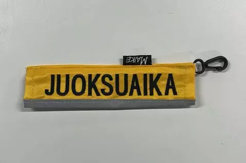 Taluttimeen kiinnitettävä putki tekstillä. Kiinnitetään pikkulukolla taluttimen lukkoon. Teksti molemmilla puolilla putkea, heijastinnauha lisää näkyvyyttä.