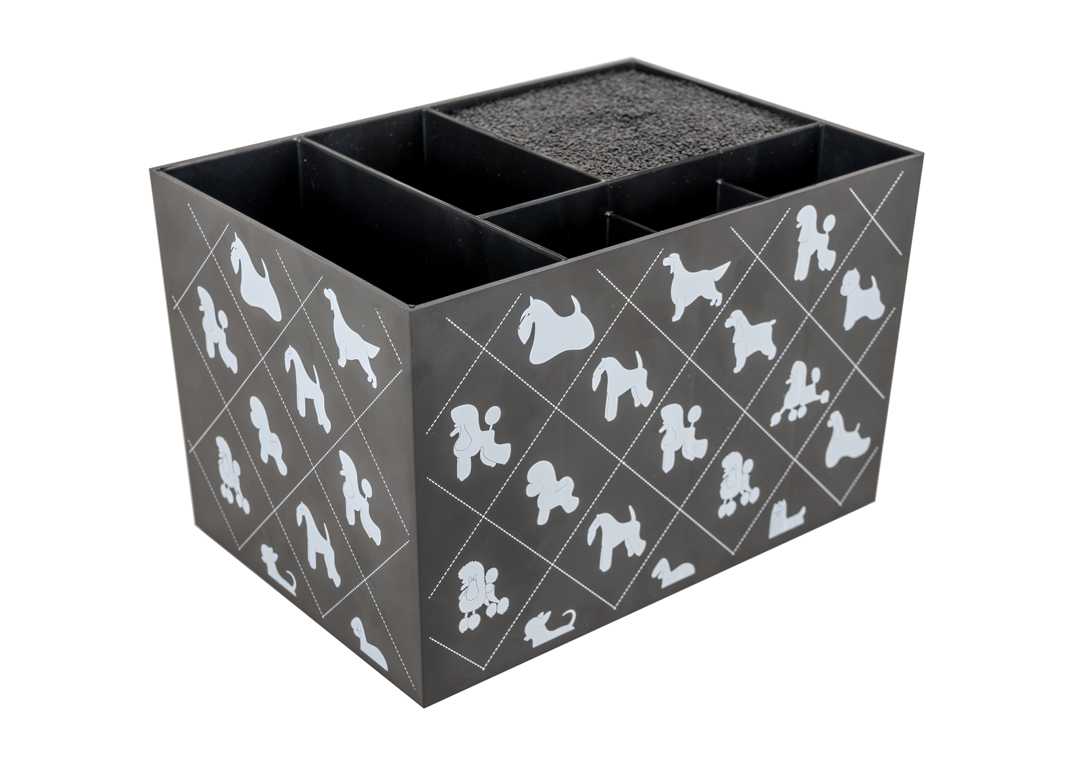 Tämä kätevä, eri osastoista koostuva laatikko on loistava ratkaisu pienempien hoitovälineidesi, kuten harjojen, pinsettien, kynsileikkurien, trimmausveitsien ja kampojen säilyttämiseen. Tässä hauskalla K-Designilla varustetussa caddissa on lokero, joka on erityisesti suunniteltu säilyttämään arvokkaat sakset turvallisesti ilman, että ne koskettavat toisiaan. Maailmankuulu K-Design, jonka on luonut hoitoalan asiantuntija Kitty Dekeersgieter, tunnetaan kauniista koiran siluetteistaan! Voit työskennellä yksinkertaisesti ja tehokkaasti asettamalla työkalukotelon pöydällesi.