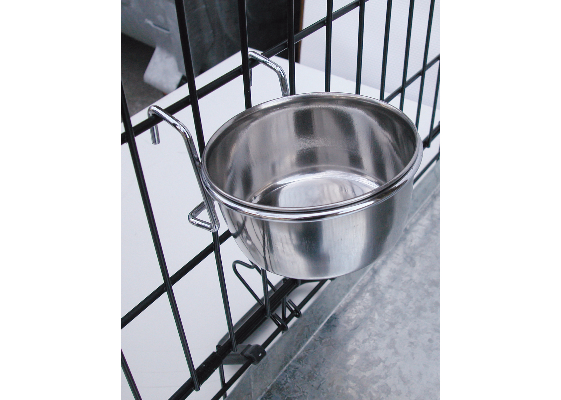 Kätevä ripustettava teräskuppi teräksisellä ripustusrenkaalla mm. näyttely/autohäkkiin, ulkoaitaukseen, ulkohäkkiin yms.