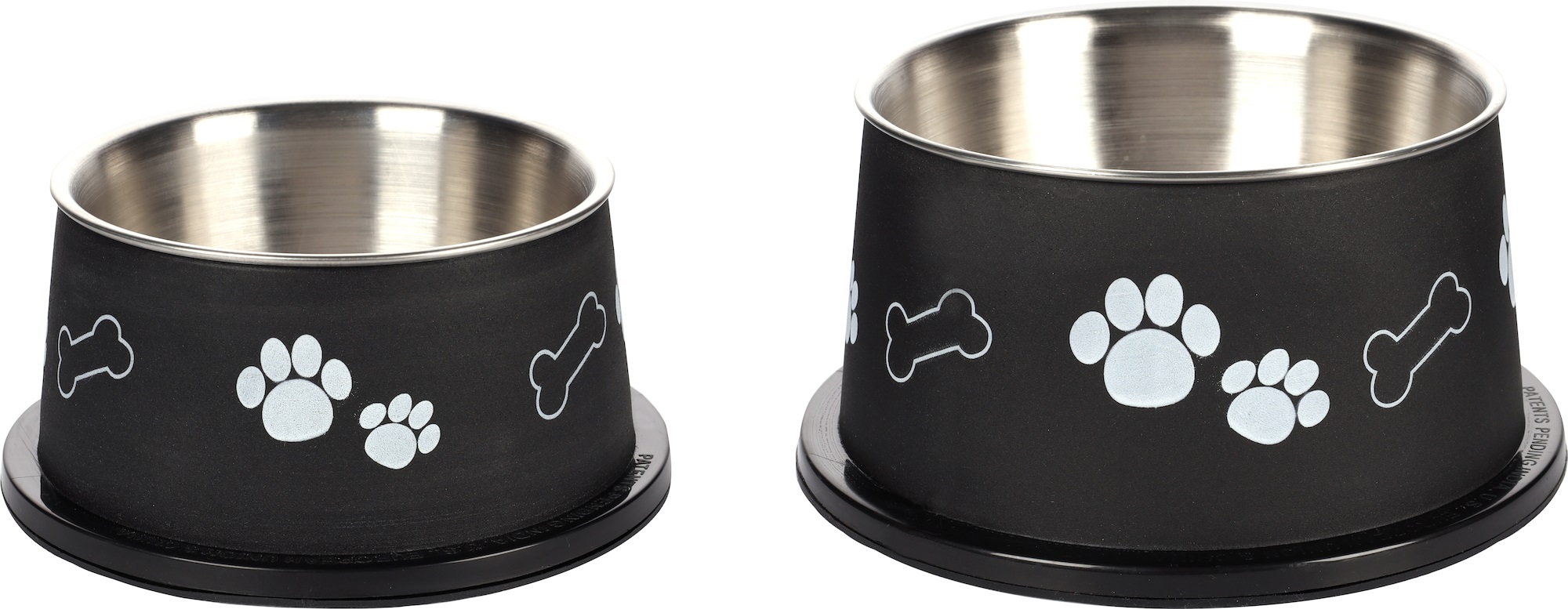Korkeareunainen metallikuppi esimerkiksi pitkäkorvaisille koirille. Irroitettava kumireunus estää kupin liukumisen lattialla. Poista kumireunus ennen kupin konepesua.