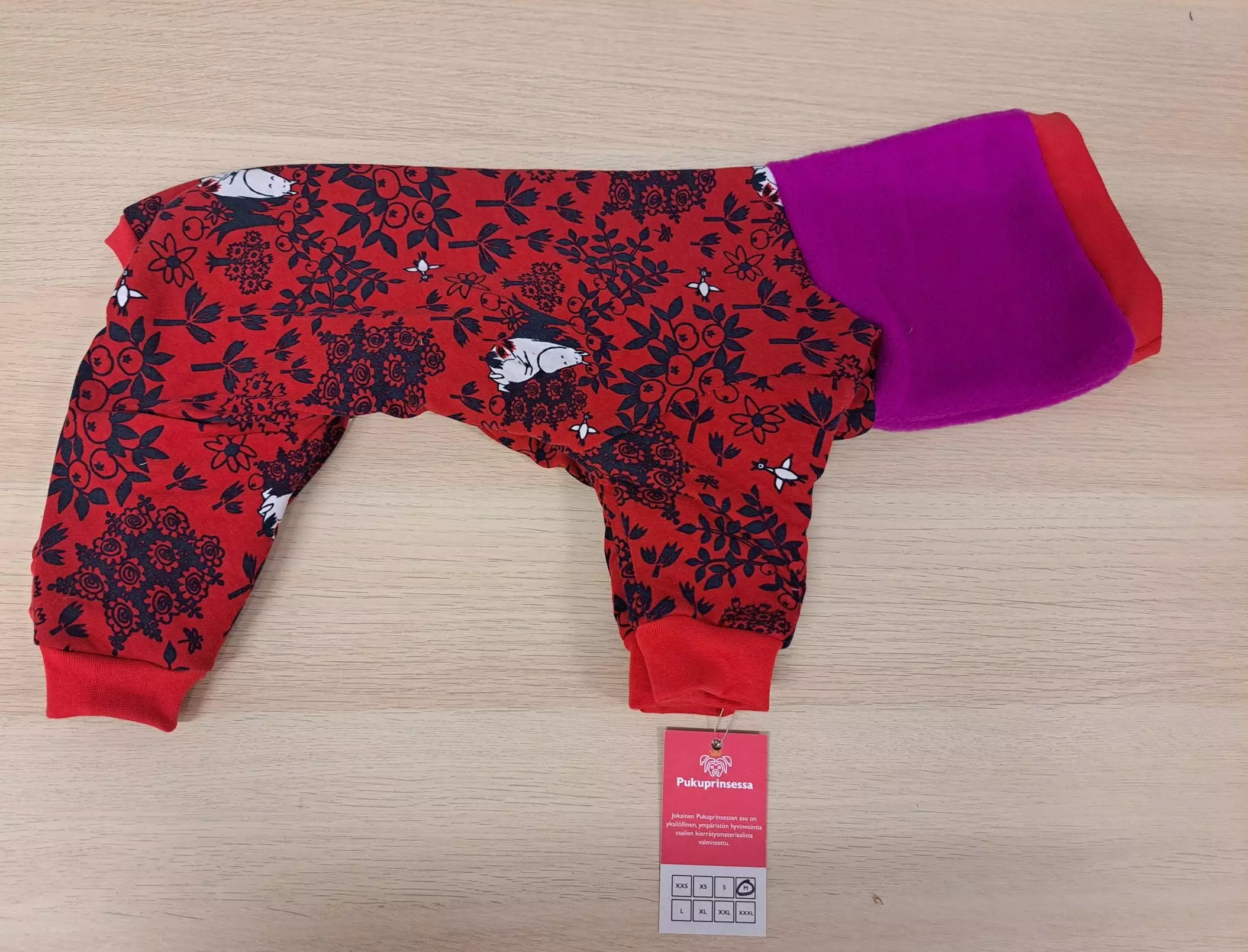 Koirien muumi-kuviollinen trikoohaalari fleecevuorella on Suomessa käsityönä valmistettu, lämpimämpi vaihtoehto viileisiin päiviin. Selän pituus 35cm.