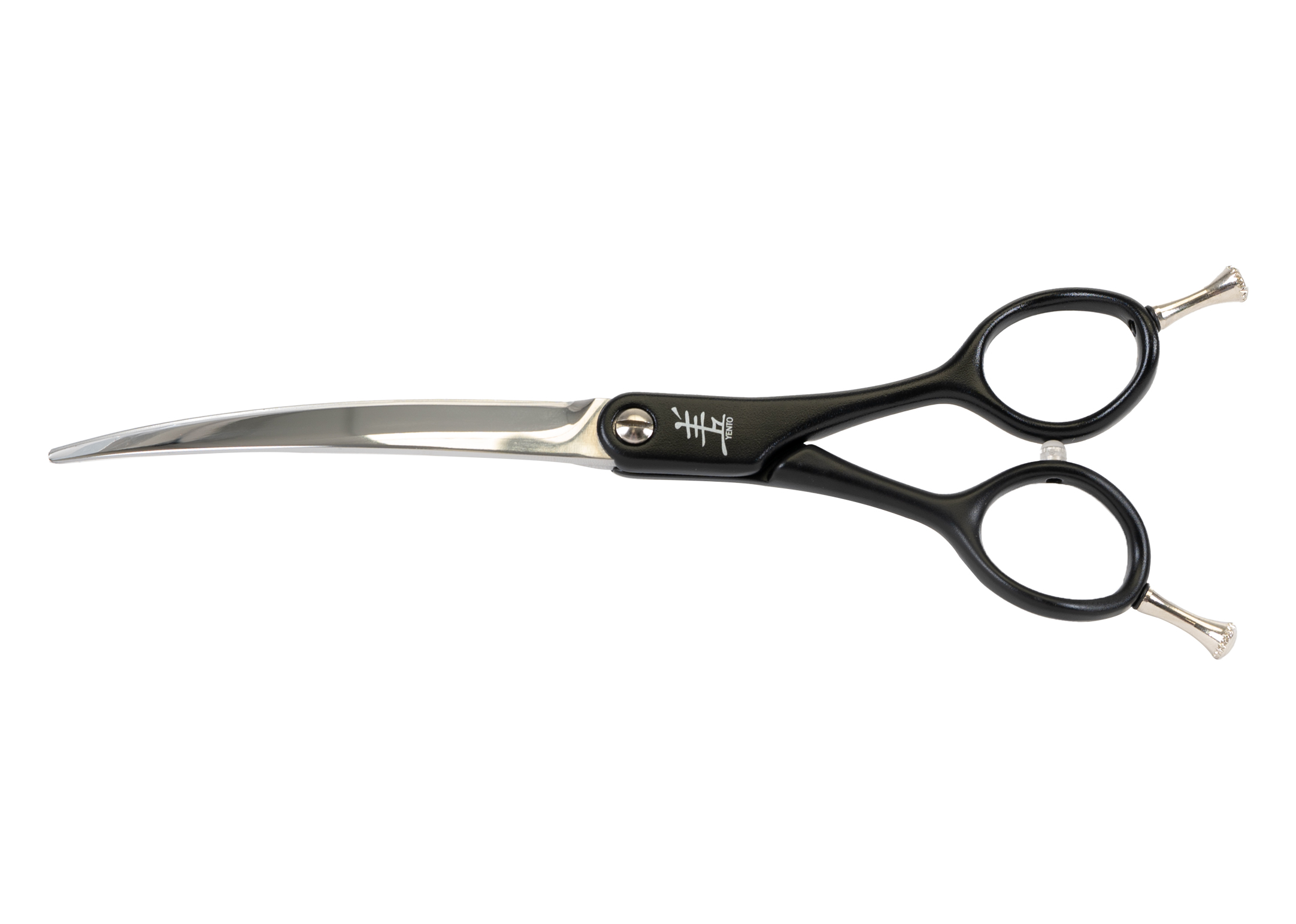 Kaarevat, mustat sakset mm. turkin muotoiluun ja lyhentämiseen.