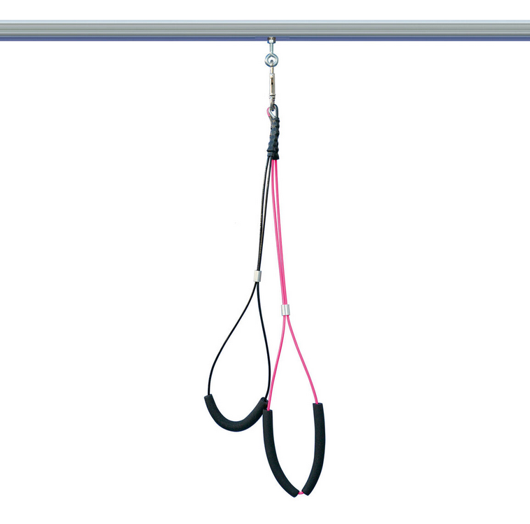 Kaksinkertainen trimmihihna koirien hoitoon, pehmustettu osa tekee hihnasta mukavamman tuntuisen. Yksi hihna tukee kehoa ja toinen kaulaa, joten ne pitävät eläimen pystyssä, turvallisesti ja mukavasti. Pehmustetut osat auttavat koiria, joilla on reuma, niveltulehdus tai koiran väsyessä.