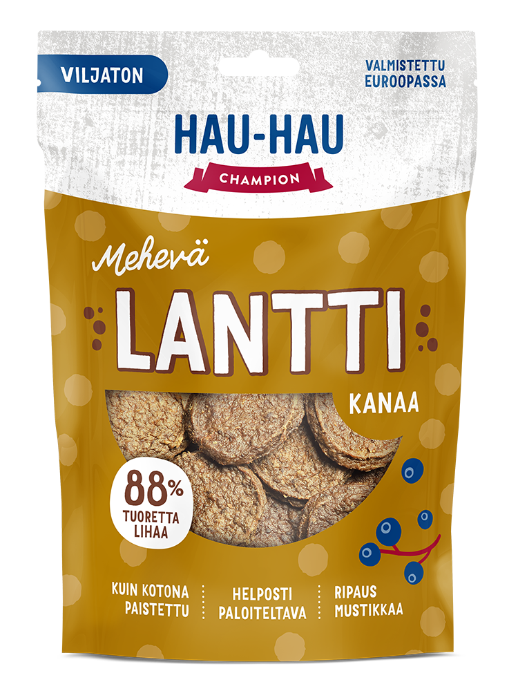 Hau-Hau Champion Mehevä Lantti Kanaa sisältää jopa 88 % tuoretta lihaa. Lantit on pyöritelty lihaisasta taikinasta, johon on lisätty ripaus marjapuristetta. Tuloksena syntyi kuin kotiuunissa paistettu makupala, jonka huumaava tuoksu houkuttelee paikalle kaikki perheen hännänheiluttajat.
