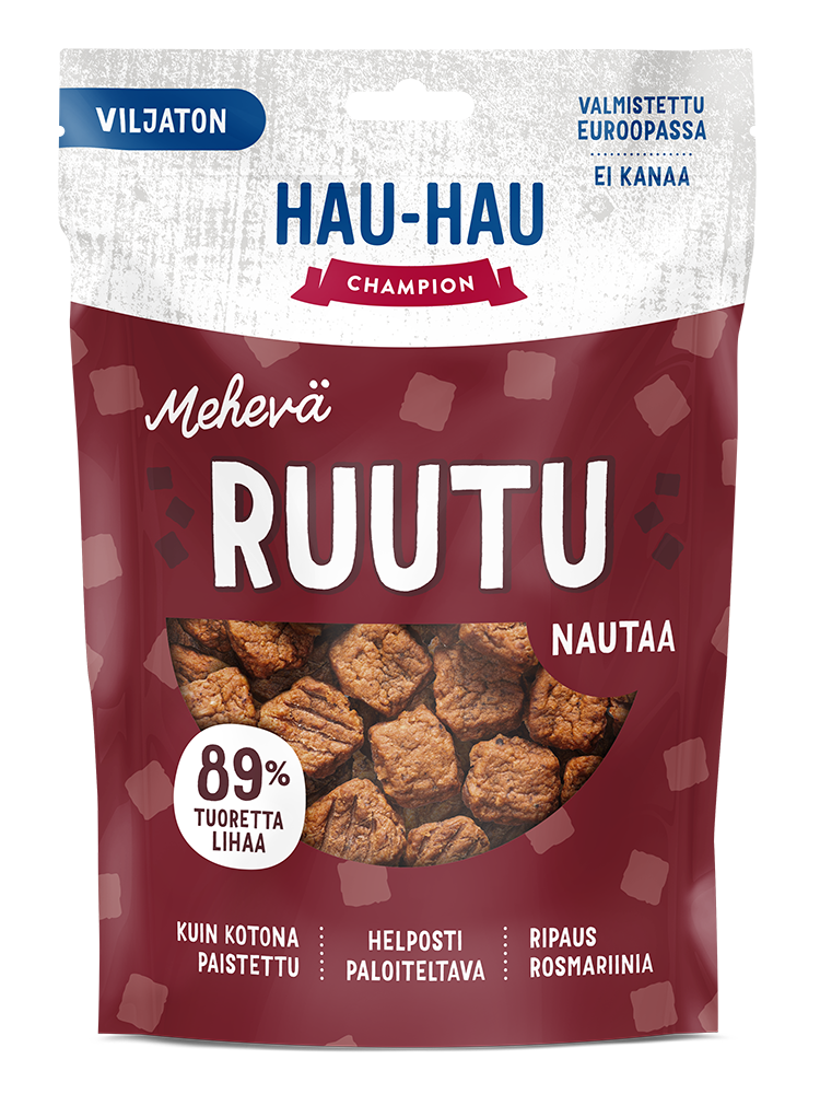 Hau-Hau Champion Mehevä Ruutu Nautaa sisältää jopa 89 % tuoretta lihaa. Ruudut on pyöritelty taikinasta, jossa on käytetty proteiininlähteenä ainoastaan naudanlihaa. Tuoreesta raakalihaseoksesta muotoillut ruudut kypsennetään pitkään matalassa lämpötilassa, mikä takaa niiden erinomaisen maistuvuuden. Tuloksena syntyi kuin kotiuunissa paistettu makupala, jonka huumaava tuoksu houkuttelee jokaisen kirsun namipussin äärelle. Reseptiin lisätty rosmariini sisältää koiran hyvinvointia tukevia antioksidantteja.