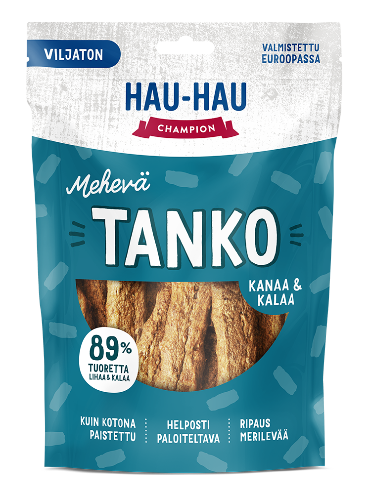 Hau-Hau Champion Mehevä Tanko Kanaa & Kalaa sisältää jopa 89 % tuoretta lihaa ja kalaa. Tuoreesta raakalihaseoksesta muotoillut tangot kypsennetään pitkään matalassa lämpötilassa, mikä takaa niiden erinomaisen maistuvuuden. Tuloksena syntyi kuin kotiuunissa paistettu makupala, jonka huumaava tuoksu houkuttelee jokaisen kirsun namipussin äärelle.