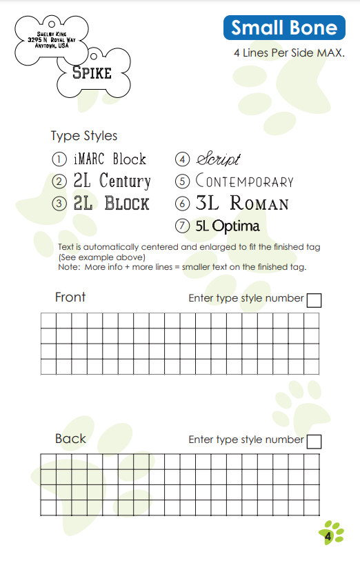 Luun mallinen, kevyt, alumiininen nimilaatta, johon kaiverretaan vaikka lemmikkisi yhteystiedot. Mukana kiinnitysrengas, jolla laatan voi kiinnittää pantaan tai valjaisiin. Kaksi kokoa.