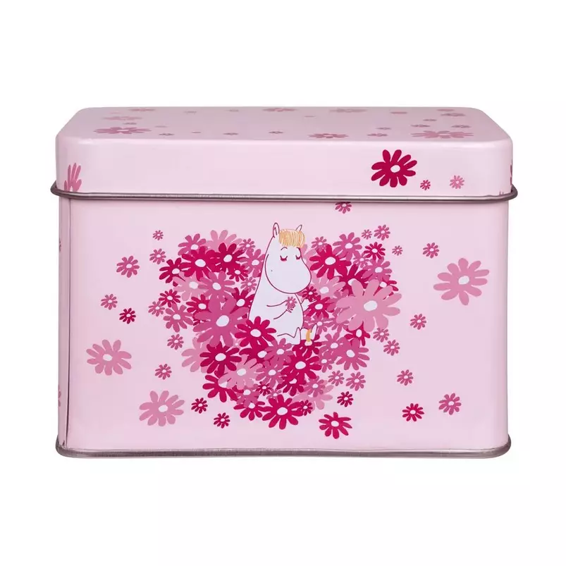 Pinkki peltinen Muumi-teepurkki rakkaudentäyteisellä Kukkasydän-kuosilla on täydellinen lahja ystävälle tai rakkaalle.