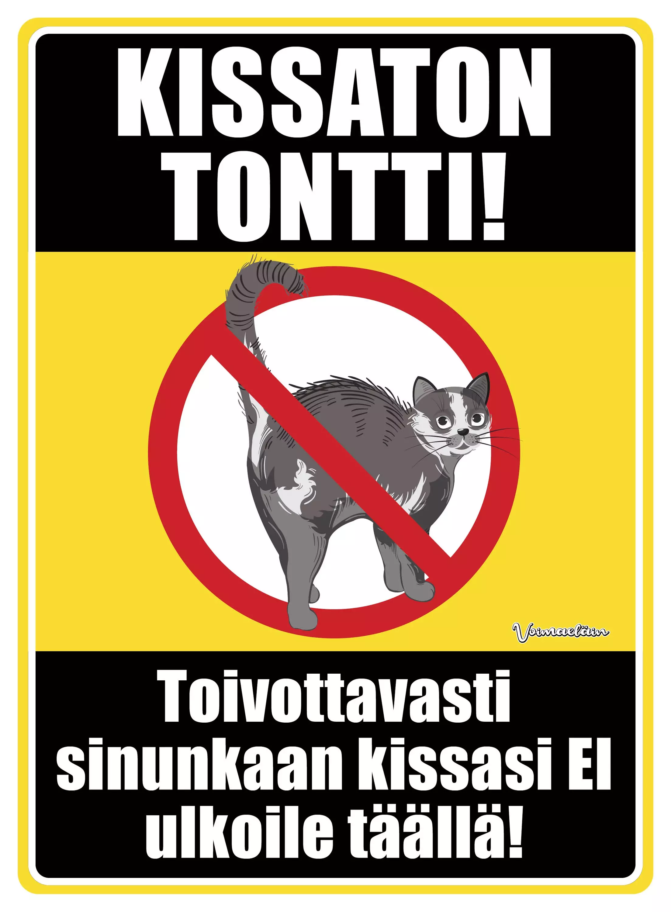 Kyltti Kissaton tontti! Toivottavasti sinunkaan kissasi EI ulkoile täällä!