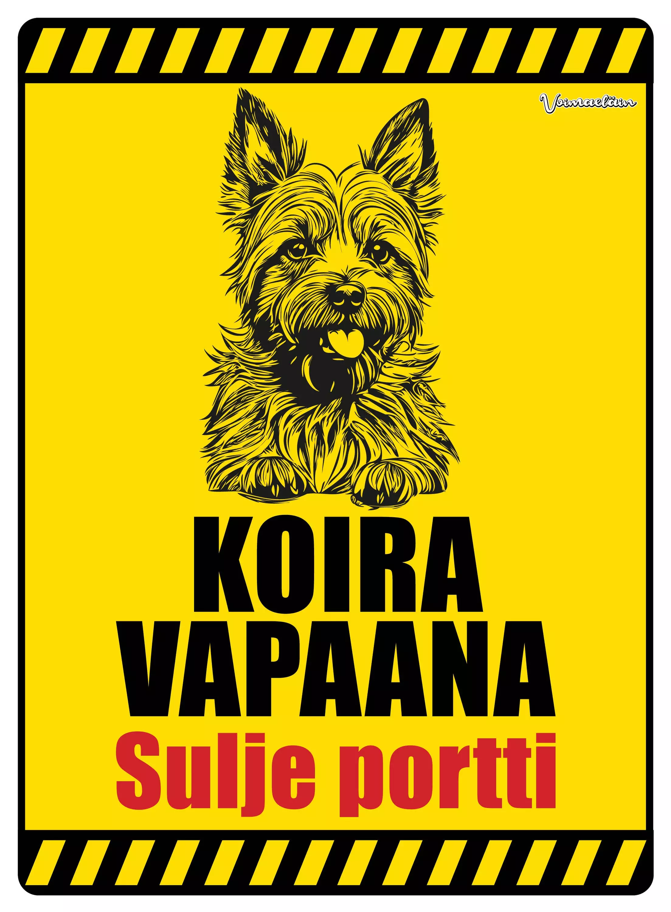 Kyltti Koira vapaana sulje portti! Cairnterrierin pää