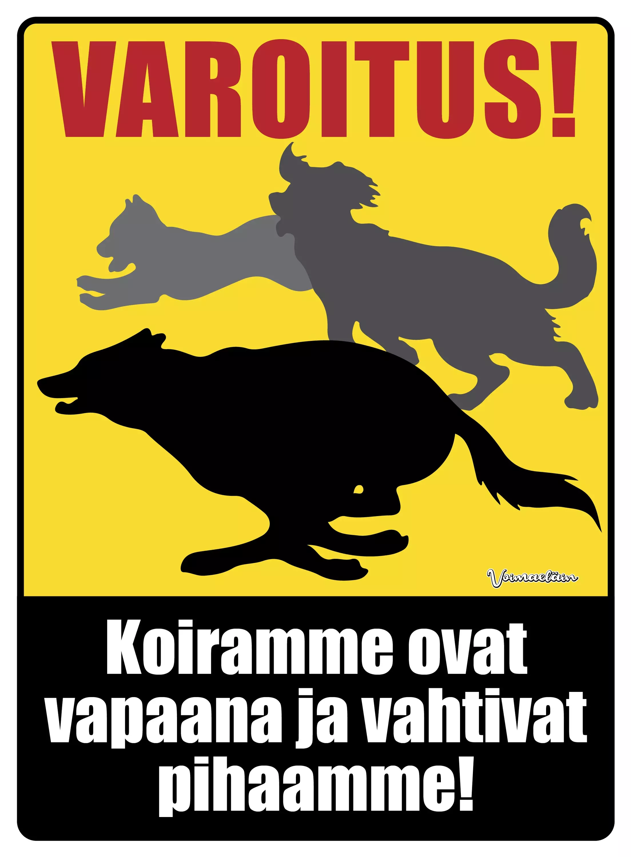 Kyltti Varoitus! Koiramme ovat vapaana ja vahtivat pihaamme!