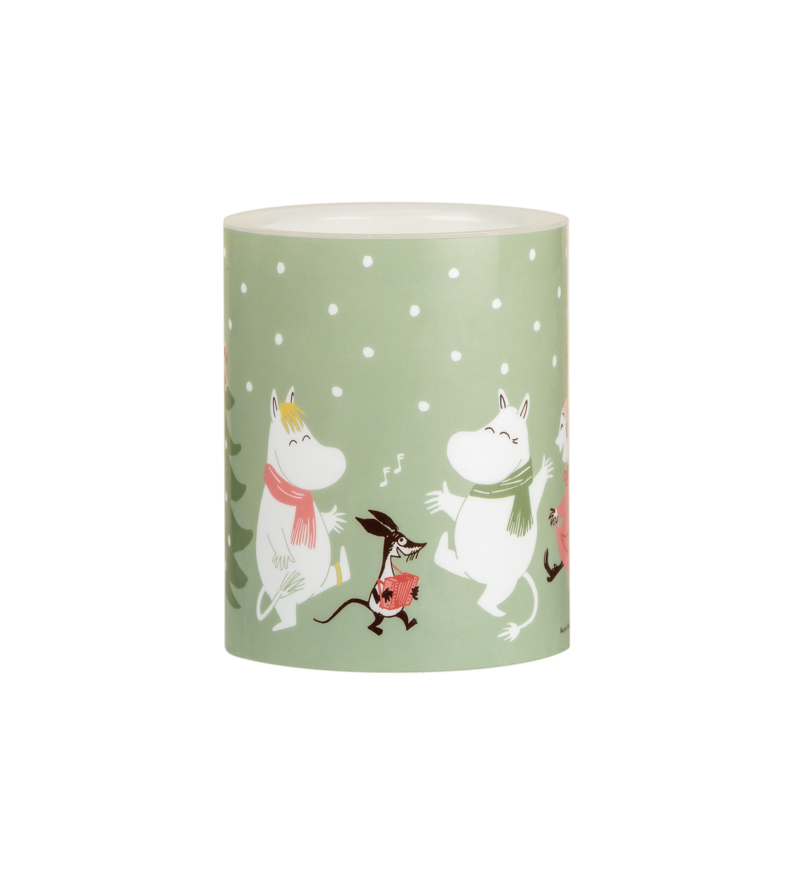 Sisäkäyttöön uunniteltu LED-kynttilä muistuttaa aitoa kynttilää ja sen elävää liekkiä. Koristeena juhlivia muumihahmoja.