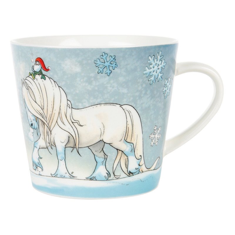 Kaunis siniharmaasävyinen muki, jossa on Lena Furbergin ihastuttava kuvitus pitkäharjaisesta valkoisesta hevosesta kulkemassa lumisateessa. Hevosaiheinen muki tuo iloa aamu- tai välipalahetkeen lämpimän juoman kera!