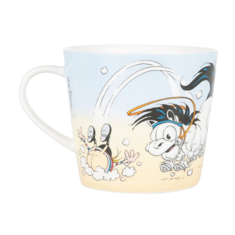 Vauhdikas muki ilahduttaa aamiaishetkessä, välipalalla tai iltapalalla. Kupillinen vaikkapa lämmintä kaakaota tai virkistävän viileää juomaa maistuu erityisen hyvältä Pollen seurassa. Mukin kyljissä seikkailee Lena Furbergin luoma Polle, joka temppuilullaan onnistuu lopulta pudottamaan ratsastajansa pois selästään.