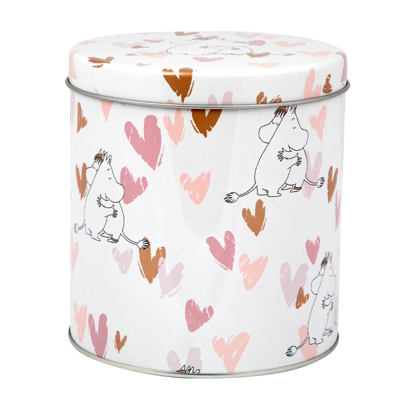 Lumoavan suloinen peltirasia, jossa on kansi. Reilun kokoisen peltipurkin halkaisija on 13 cm ja korkeus 14 cm. Rasiassa on herkästi väritettyjä suloisia sydämiä sekä kuvia Muumipeikosta ja Niiskuneidistä halaamassa toisiaan hellästi. Ystävyys on arjen supervoima! Purkkiin mahtuu joululeivonnaiset, herkut tai vaikkapa pienet aarteet. Monikäyttöinen peltipurkki tuo muumimaista ilmettä säilytykseen ja se sopii mainiosti myös lahjaksi.