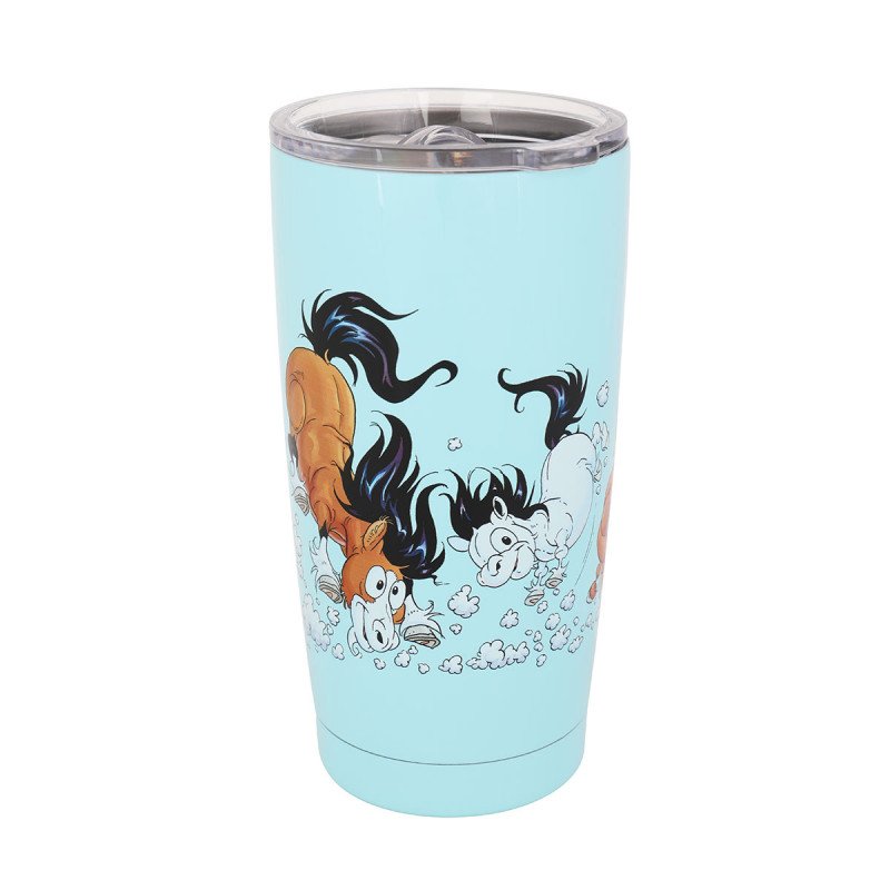 Kauniin sininen termosmuki, jonka tilavuus on 5 dl. Kookkaan mukin kyljissä seikkailee Lena Furbergin luoma ystävineen. Teräksinen termosmuki pitää juoman kuumana 2 h ja kylmänä 7 h.