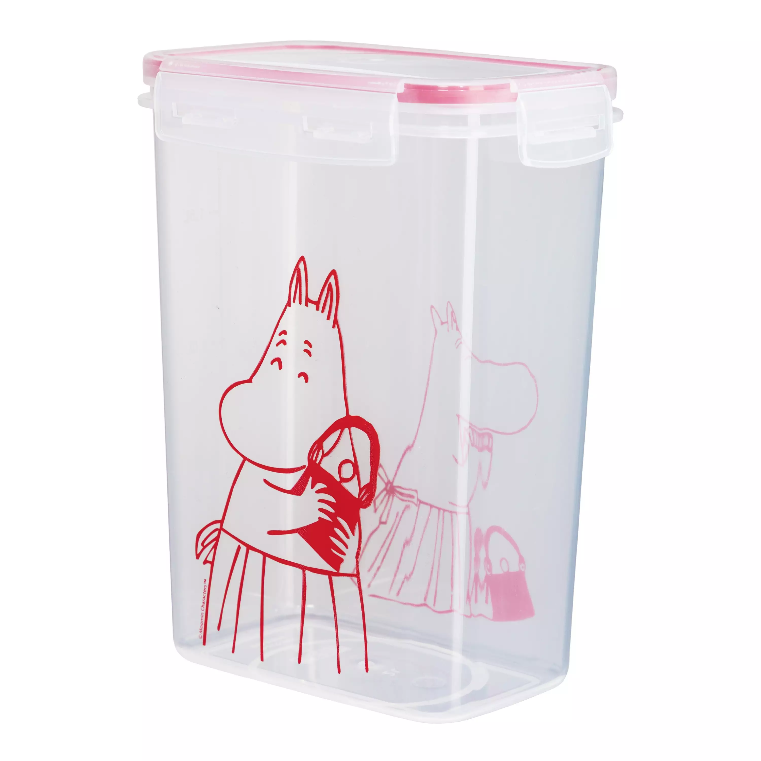 Kätevä PP-muovinen säilytysrasia, jossa on tiivis kansi. Purkissa voi säilyttää esim. jauhoja, pastaa jne., ja ne sopivat mainiosti myös jääkappiin, pakkaseen tai eväsrasiaksi. Säilytysrasioita koristaa ilmeikkäät muumihahmot.