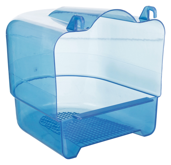 Kylpytalo linnuille sininen 15x16x17cm Trixie Läpinäkyvä, sininen kylpytalo linnuille. Edessä koukut, joilla kylpytalon saa häkin oveen kiinni.