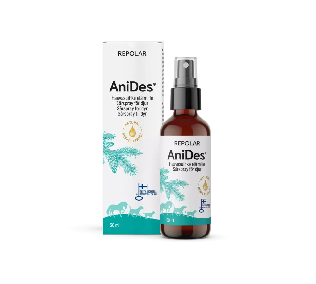 AniDes® Haavasuihke on tarkoitettu haavojen, ihovaurioiden ja ärtyneen ihon hellävaraiseen käsittelyyn eläimillä. Öljymäinen suihke muodostaa suojaavan ja rauhoittavan kalvon sekä kosteuttaa kuivaa ja kutisevaa ihoa sekä haavareunoja.