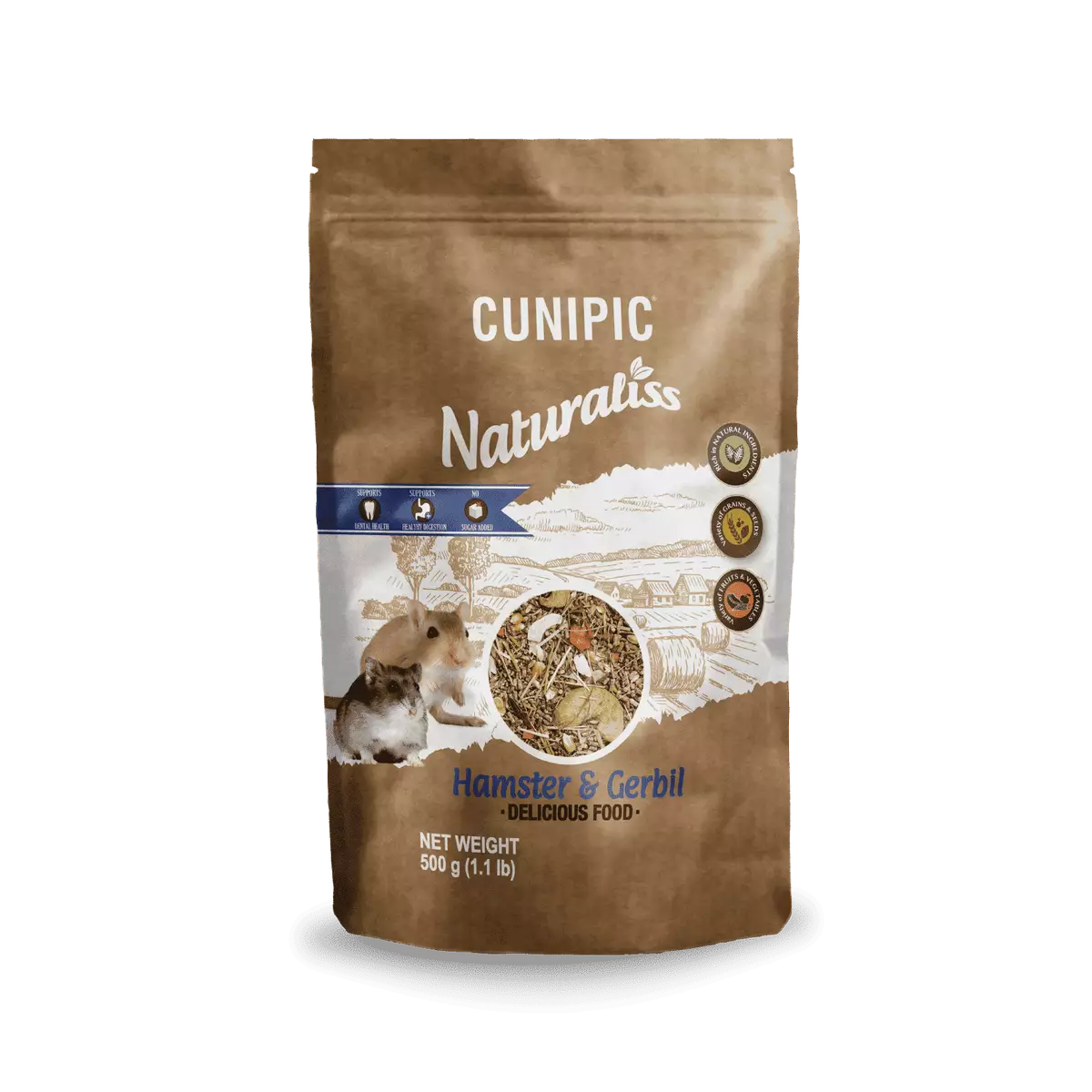 Cunipicin Naturaliss Hamster & Gerbil on kaikenikäisille hamstereille ja gerbiileille soveltuva täysravinto. Se sisältää kaikki tarvittavat ravintoaineet, jotta pieni lemmikkisi kasvaa terveeksi, vahvaksi ja onnelliseksi.