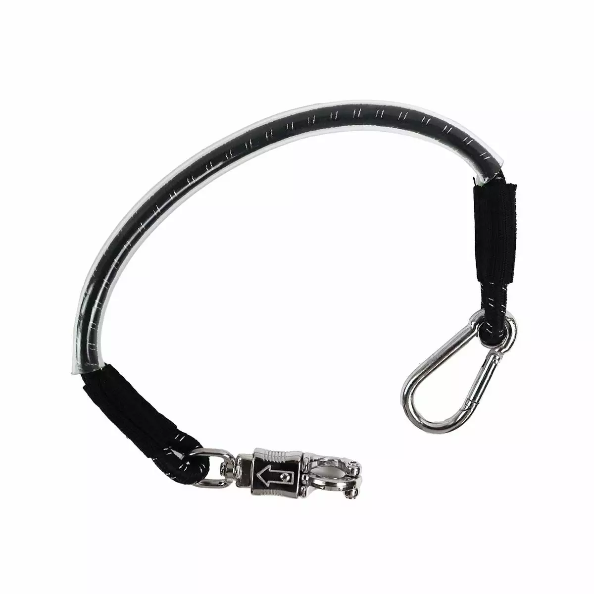 Muovilla päällystetty kiinnitysnaru lukoilla. Joustava kiinnitysnaru sopii hevosen kiinnittämiseen esim. käytävälle. Toisessa päässä paniikkilukko ja toisessa palohaka.