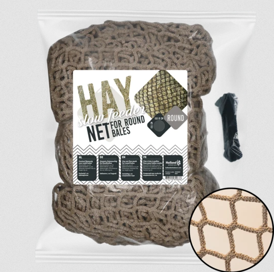 Pyöröheinäpaalin päälle laitettava slowfeed-heinäverkko hidastamaan syömistä ja antamaan ajanvietettä. Verkon silmäkoko 45mm.